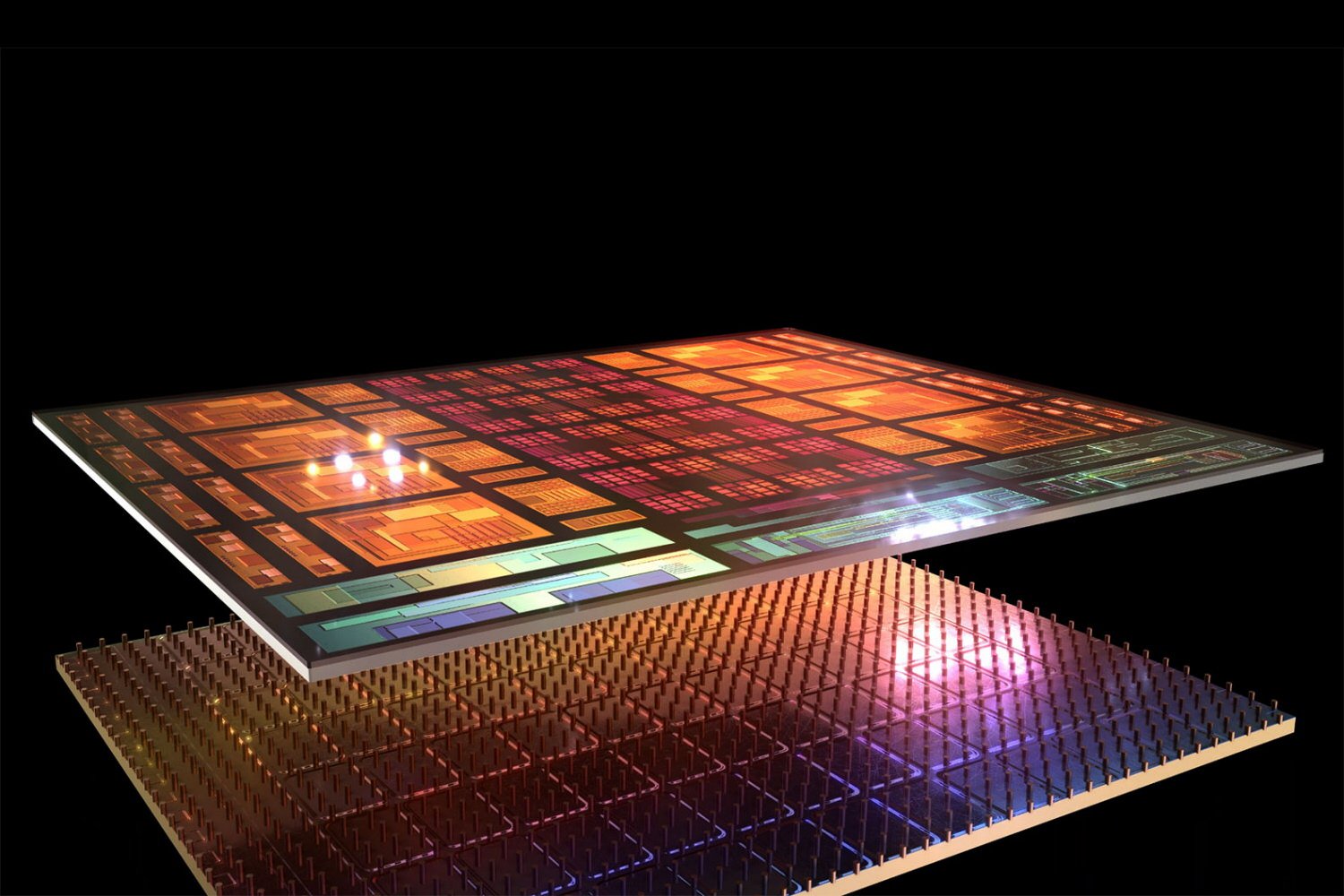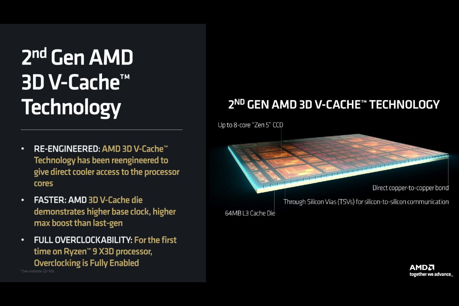 Ces CPU intègrent également la mémoire 3D V-Cache de deuxième génération, augmentant la capacité totale de cache. À l’inverse des générations précédentes, AMD a inversé le sens d’empilement, améliorant ainsi la dissipation thermique et permettant de meilleures performances.