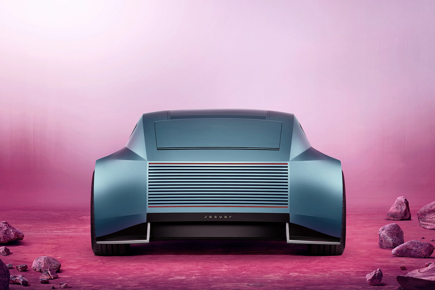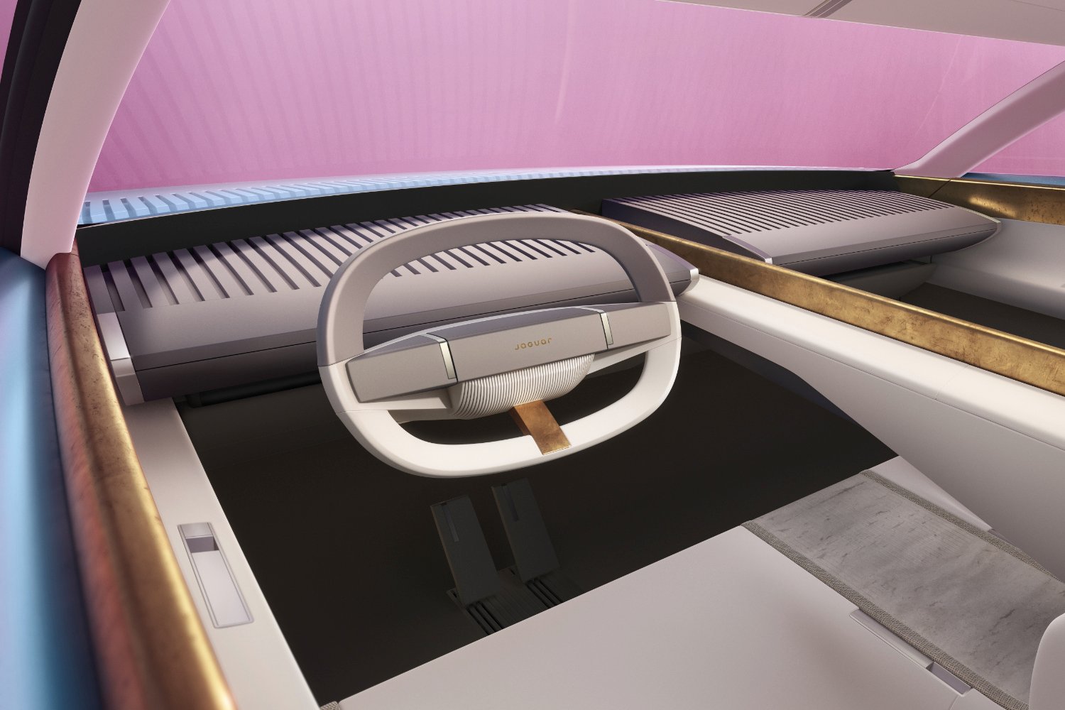 Ce qui distingue le concept Type 00 de ses concurrents est sa face avant et arrière, évoquant une grille d’aération futuriste. Un nouveau logo, inscrit en lettres majestueuses, orne l’avant et l’arrière, tandis que le symbole emblématique du jaguar prend place près des ailes avant. Les portes en élytre s’ouvrent pour révéler un intérieur minimaliste, caractérisé par une pièce transversale de 3,10 m, éliminant la traditionnelle console centrale et redéfinissant l’espace intérieur.