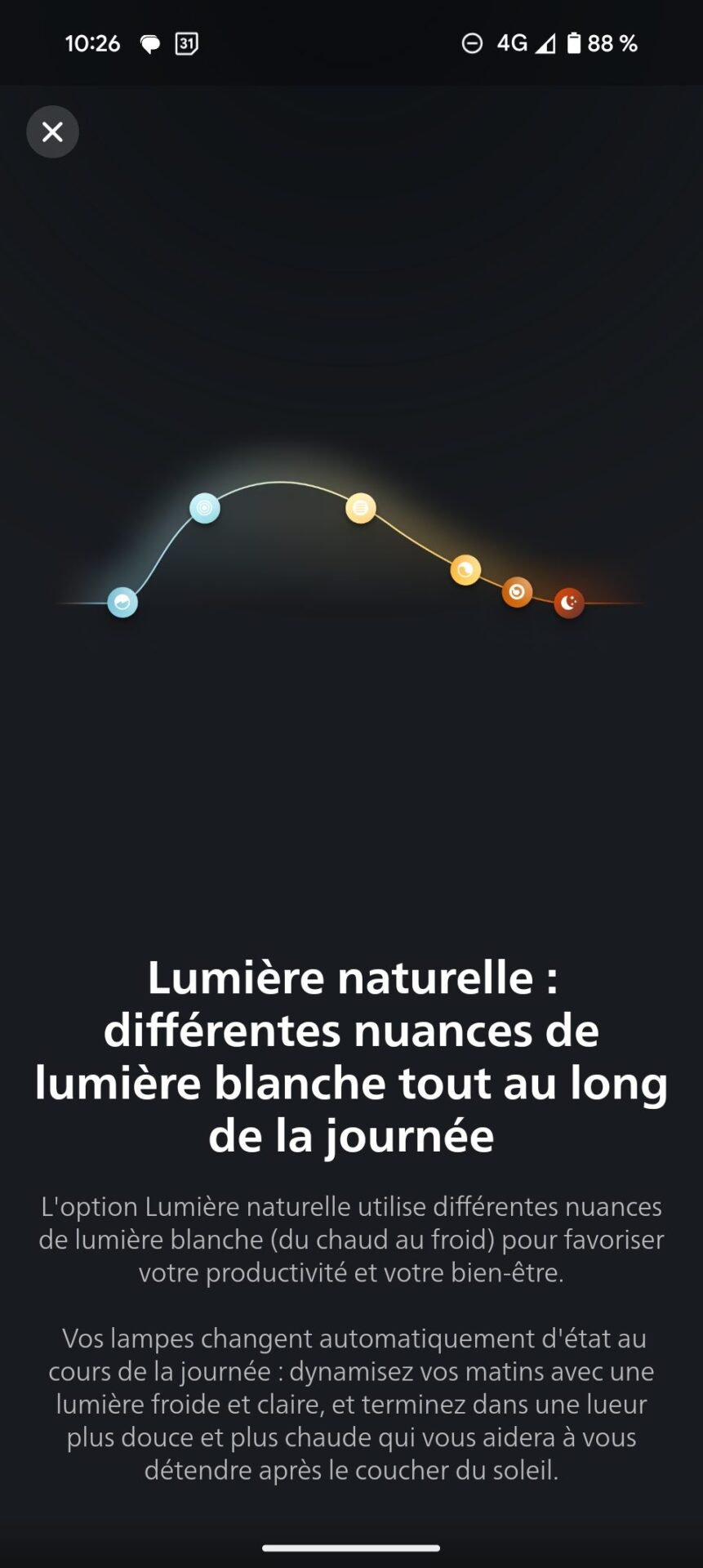 Avec la version 5.32, Philips Hue introduit des scènes lumineuses personnalisables sur 24 heures. Cette innovation permet aux utilisateurs de configurer des couleurs et des niveaux de luminosité qui s’adaptent tout au long de la journée, selon leurs besoins et préférences.