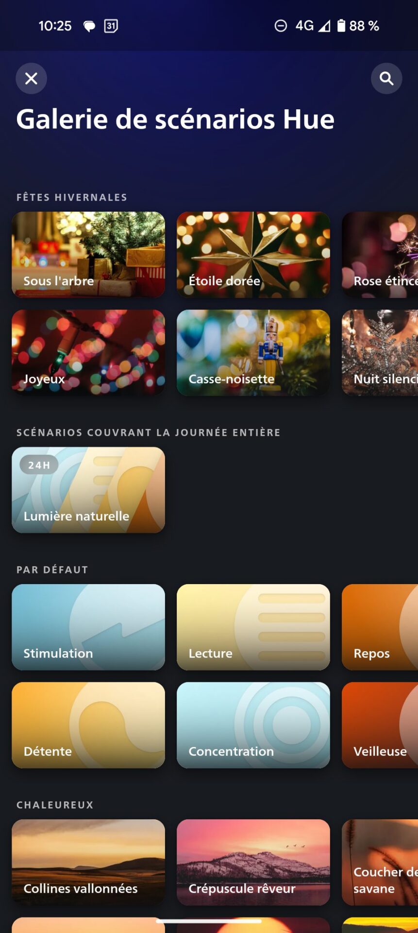 Bien que l’on puisse déjà user de scènes préconfigurées pour des ambiances sur mesure, cette mise à jour simplifie grandement le processus en offrant la possibilité de partir de zéro. Pour les festivités, Philips Hue enrichit aussi son catalogue avec dix nouvelles scènes, pour ajouter une touche conviviale à vos fêtes de fin d’année.